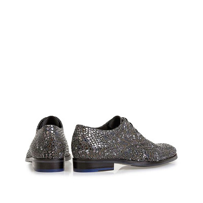 Het grijze leer van deze schoen is voorzien van een grafische patroon van zwarte en blauwe lijnen. Hier overheen is d.m.v. een chemische bewerking het reliëf van de buik van een krokodil aangebracht. De toppen van het reliëf hebben een zijdeglans. Dit is een derby veterschoen met een slijtvaste, grijze TPU zool. De lederen opbouwhak is middels een sierlijke zwaluwstaartverbinding opgedeeld in een rubberen vlak en een lederen vlak. Het interieur van de schoen is bekleed met topkwaliteit kalfsvoering. De zool is doorgenaaid volgens de Blake maakwijze.